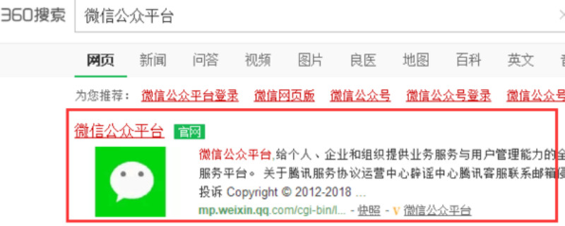 在百度浏览器中搜索“微信公众平台”,点击链接进入微信公众平台官网。