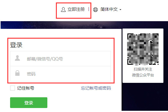 点击网站右上方立即注册。填写邮箱/微信号/QQ号和密码登录。
