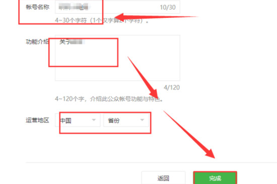 填写帐号名称、功能介绍、选择运营地区。点击“完成”。
