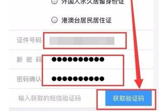 4、根据页面提示依次的输入手机号和身份证号码,经过系统审核后重新输入新的密码,还需再输入一遍确认新密码。
