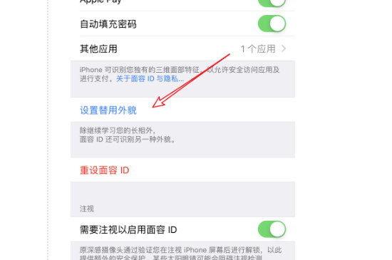 3、点击设置替用外貌,将手机的摄像头对准脸部,根据提示录入面部信息,完成后即可使用面容解锁。