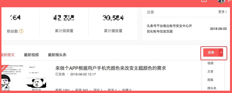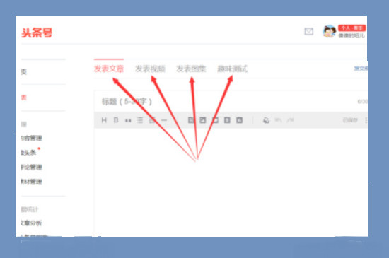 3、登录上个人账户之后点击界面中的发表选项,这时就会出现发表文章、发表视频、发表图集和趣味测试的选项。选择发表文章就可以输入和粘贴文字了,注意发表文章之前需要写上标题。