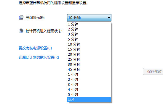4、将关闭显示器和使计算机进入休眠状态设置为从不。