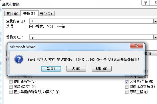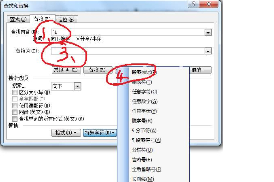 在打开的的对话框中,点击特殊格式弹出段落标记,然后找到^p命令,全部进行替换。