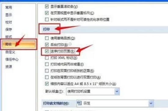3、往下用鼠标翻动,找到打印下面的“逆序打印页面”进行勾选。