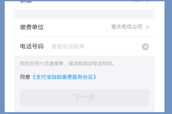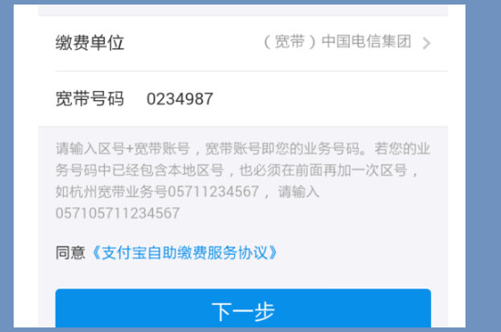 确定缴费单位之后,把绑定宽带的电话号码输入并选择下一步,确认宽带账号之后就可以进行缴费操作。