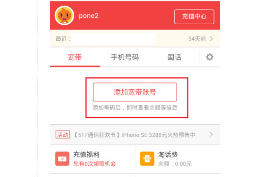 打开淘宝客户端,在个人中心页面找到“我的通信”,点击宽带添加自己的宽带账号后,输入宽带账号、姓名以及自己所在区域,点击确定,刷新一下页面,就可以直接查询联通宽带余额了。