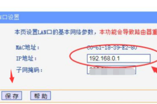 4、在IP地址处将原本地址的改为192.168.1.1,改完后记得点击保存。