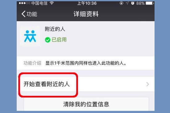 如果微信目前还没有启动附近的人,系统就会显示“启用该功能”的选项,点击之后就看到已经启用了附近的人搜索系统。