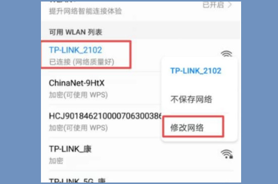 在网络页面选择已经连接但是没有网络的wifi,长按wifi名称之后会出现一个跳转框,此时点击“修改网络”即可。