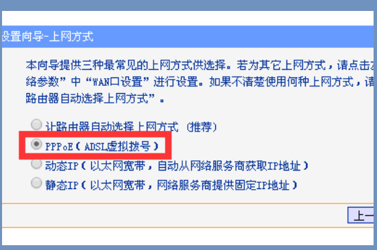 进入页面之后点击左边的设置向导并选择“下一步”,在会话框内勾选“PPPoE”之后点击下一步,最后根据提示设置网络密码和账号并保存即可。