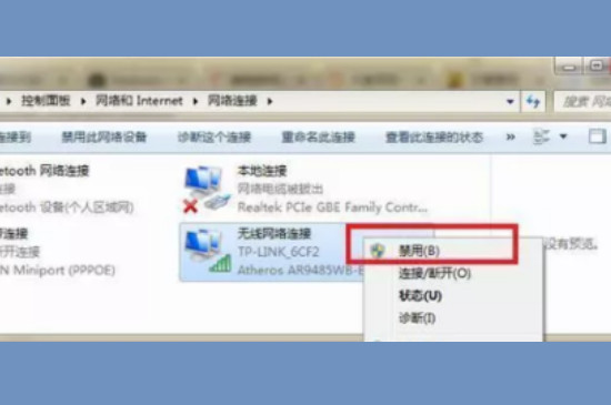 打开电脑的控制面板之后找到“网络和共享中心”,此时点击“更改适配器”之后右键禁用本地连接,同时使用无线网络连接,将本地连接关闭之后再右键打开本地连接,等待无线网络进行连接即可。