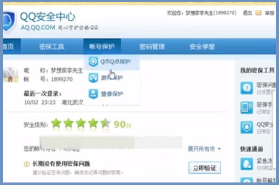此时页面会跳转进入网页,进入qq安全中心网页之后点击“账号保护”,在账号保护跳转出来的工具栏内点击“登录保护”。