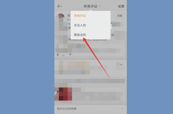 进入评论专区之后就可以看到所有微博的评论,点击最上方所有评论后面的箭头,选择“我发出的”选项并进行筛选。