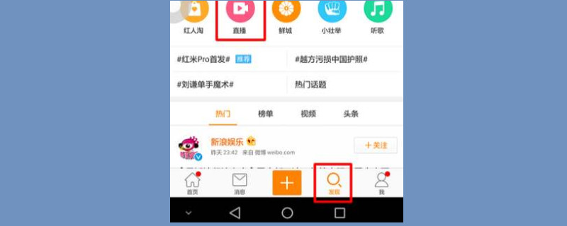 想要用微博看最近浏览记录,首先打开微博之后进入微博主页,等待页面跳转之后点击并进入微博浏览主页,此时可以看到最底部有五个选项,找到带有放大镜符号的按钮并点击“发现”选项即可。