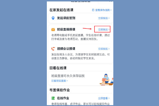 此时出现了在线课堂页面的相关设置,点击班级直播授课右边的“立即发起”,就可以打开摄像头进入相机测试的环节。