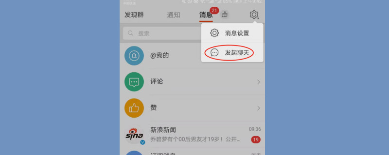 打开手机微博客户端之后,点击主页下方的“消息”选项,此时就可以进入微博的个人信息中心。点击跳转页面的右上角齿轮,在弹出的会话框内选择“发起聊天”选项,就可以开始创建群聊。