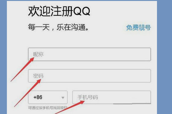 点击进入qq注册之后,系统会弹出一个信息填写的页面,此时需要根据系统要求填写qq昵称、密码以及绑定的手机号。