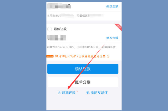 进入还款页面之后,屏幕会显示目前需要还款的金额以及最低还款的金额,此时查看账单分期下面是否有延期还款的选项,如果有就点击进入页面,如果没有那可能还款的日期已经过了,无法进行延期还款的操作。