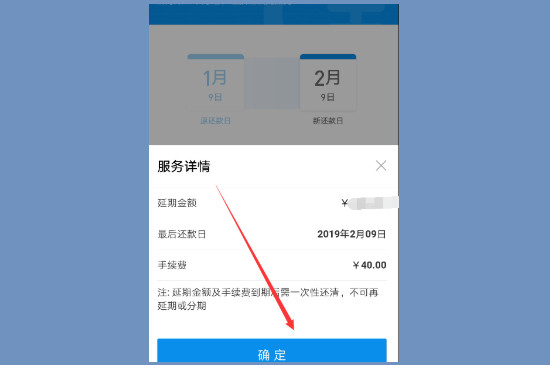 进入延期还款功能之后,界面会显示原先的还款日以及新的还款日,一般时间差一个月左右,还会显示延期还款需要的手续费,确认手续费之后点击“立即延期”之后就会跳转支付页面,点击“确定”后就可以办理延期还款。