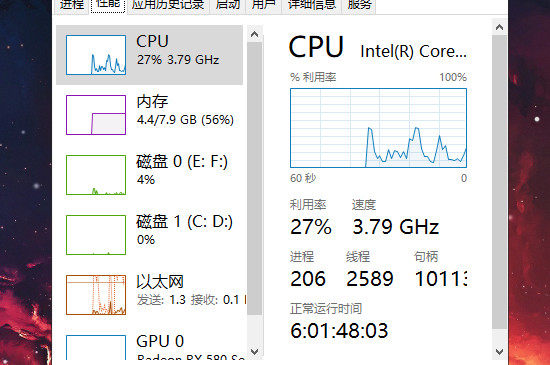 打开任务管理器之后点击上方的菜单栏,点击“性能”之后就可以进入跳转的页面。此时可以看到cpu的主频、核心数、一级缓存、二级缓存等参数。