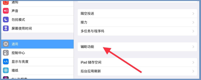 点击平板的设置选项之后进入页面,找到“通用”功能之后点击进入并打开平板的“辅助功能”。进入辅助功能之后就可以看到很多关于平板的功能设置,将“辅助触控”前面的按钮打开之后进入设置。