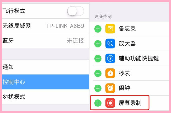 在自定控制中找到附加控制,下拉页面一直找到“屏幕录制”选项为止,此时点击屏幕录制前面的绿色加号就可以把选项加入自定控制里。