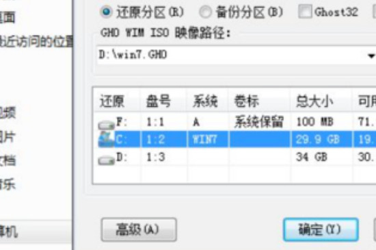 2、双击打开Onekey ghost安装工具后选择“还原分区”,而gho win iso映像路径选择win7.gho文件,安装位置选择容量较大的除C盘以外的磁盘,之后再点击确定。