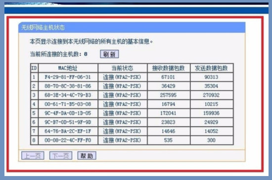 此时页面中间会出现一个表格,表格内都是目前正在连接网络的设备,包括连接的ID以及MAC地址都会显示出来。