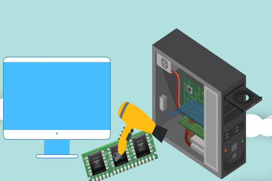 电脑因为内存条或内存插槽接触不良而蓝屏时,需要打开电脑机箱并拔出内存条,之后用吹风机吹干机主机内灰尘,同时擦干净内存条金手指,再将内存条装回去即可。若是内存条损坏导致电脑蓝屏,则需要更换内存条才能解决。