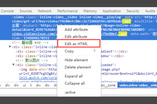 点击视频之后右键“审查元素”,此时会弹出代码框,直接按快捷键“Ctrl+F”之后就会弹出搜索框,搜索“MP4”之后就会出现视频的链接地址,右键链接后选择“Edit as HTML”后,复制其中以“http”开头、“.mp4”为结尾的网页即可下载。