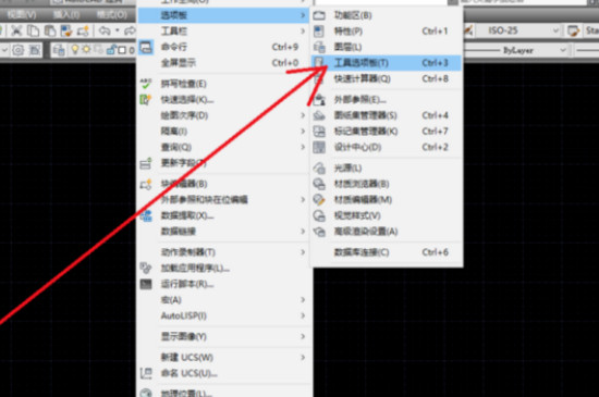 除了用快捷键打开以外,其实也可以直接点击“工具栏”中的选项卡打开选项;有时候找不到选项卡了,那是因为系统将它隐藏起来,可以通过点击“选项板”后,打开“工具选项板”让它显示出来。