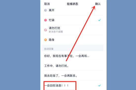 选择完毕后可以看到最下方多了一个“自动回复”的界面,可以选择系统提供的回复消息,或者是自己进行编辑。设置完成后再点击界面右上方的“确认”,就可以完成qq的自动回复了。