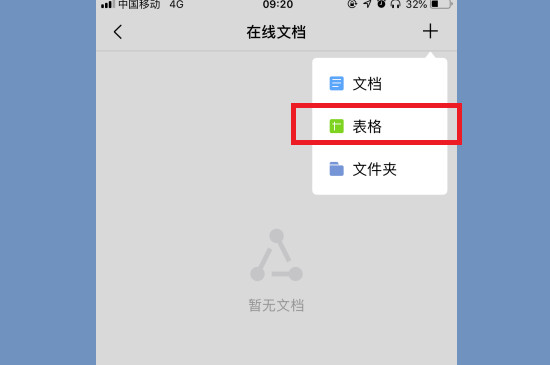 如果想新制作一个新的表格,点击界面右上角的加号,此时系统提示可以选择文档、表格、文件夹三个选择,点击“表格”选项之后就可以新建一个表格,不过相对于手机excel的表格,qq邮箱的表格功能不是很多。