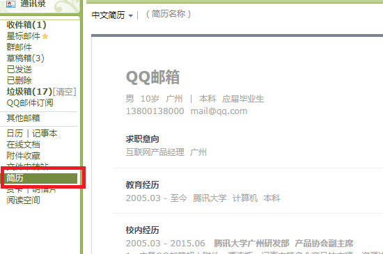 开通简历功能后,可以看到左边的工具栏已经多了一个“简历”,点击进去就可以开始撰写简历了,可以选择各种不同的简历模板,填写完毕之后记得要保存或者是直接在邮箱中发送给别人。