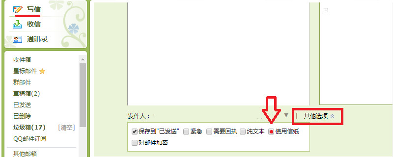 用qq邮箱可以制作带背景的邀请函,首先打开qq邮箱,点击“写信”后进入新邮件的编辑,此时将编辑文本拉至末端,可以看到最下面有一个“其它选项”的分类,点击后勾选上“使用信纸”。