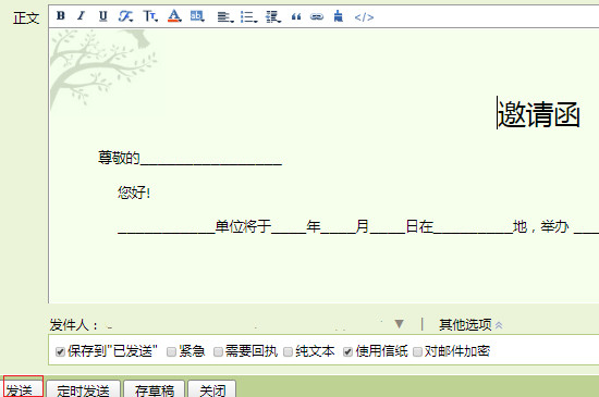 将邀请函的文字内容慢慢编辑到内容框中,确定格式都没有问题了之后,将收件人填写完整,还可以给邀请函添加一个合适的标题,最后点击左下角的“发送”选项,就可以将制作的邀请函发送出去了。