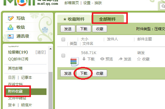 如果是批量接收邮件的附件,一个一个点邮件中的附件非常麻烦,因此可以直接找到qq邮箱左边的“附件收藏”,打开其中的全部附件,就可以看到所有邮件中的附件,直接点选进行下载就可以打开了。