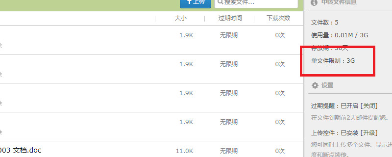 上传文件的时候注意查看邮件大小,一般是不会超过3G的,如果超过了的话,可以将文件拆分为几份,加在一起再进行中转保存。当然还可以购买会员,以此将文件上传大小扩大到6G,这样就可以直接上传了。
