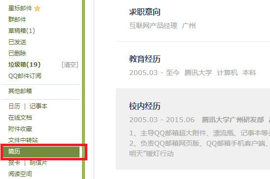 开通成功后可以看到邮箱左侧多了一个“简历”选项,选择完成后可以根据自己喜欢的简历模板制作简历,制作完后可以直接用qq邮箱发送简历,或者将简历保存在qq邮箱内,方便需要的时候拿出来使用。