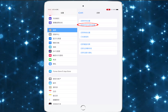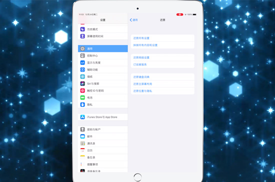 点击ipad桌面上的设置程序,下滑界面找到通用选项后点击进入,再点击还原选项,选择需要还原的项目后,点击相应项目,并按提示完成操作便可将ipad还原出厂设置。