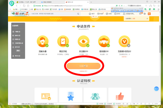4、例如身份认证,点击身份认证后,若已达成显示条件,点击“立即申请”即可完成认证。