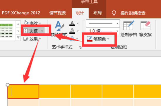 点击表格后,上方的工具栏中的选项变成了表格设计,随便点击表格内容进行编辑模式。此时点击“笔颜色”,一般表格边框都是默认颜色,将笔颜色打开后根据自己喜好改变颜色即可,甚至可以自定义颜色。