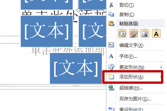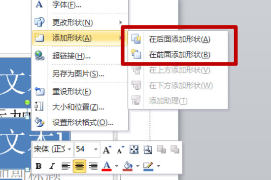 当图形处于编辑状态时,除了工具栏中的选项,还可以直接鼠标选中图形,右键点击“添加形状”的选项,此时系统会跳出“在后面添加形状”或者“在前面添加形状”,根据自身需要选择正确的选项即可。