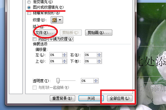 图片选择完毕后,可以根据图片本身的大小,以及自己的需求按情况勾选“将图片平铺为纹理”,设置完成后直接点击“全部应用”即可。这样后面再新增幻灯片都会是一样的背景图片了,使用起来非常的方便。