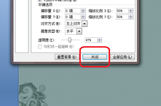 输入完成后,根据变化的背景图确定透明度。确定后如果点击关闭,那只有当前的幻灯片透明度有所更改;如果需要整篇幻灯片的背景透明度都调整的话,需要点击“全部应用”选项,点击后就会发现透明度已经改变了。