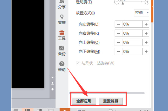 如果想后面所有新建的背景图都是一样的,那就在编辑背景的那一栏下拉到最底,找到“全部应用”这个选项,确定后所有的ppt都会是相同的背景。背景还可以改变大小以及颜色,是一种常见的使用方式。