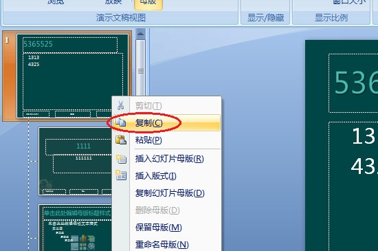 如果是准备用母版替换上去,那么就复制要替换的母版,对着左侧幻灯片右键点击“复制”,就可以复制到粘贴板里了。此时再将想要被替换的幻灯片调出来,右键对着左侧的列表选择“粘贴”,就可以了。