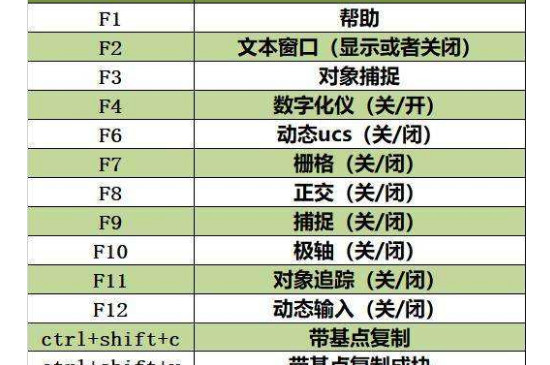 F键都有文件管理、捕捉等作用,除了注释工具外,可能还有格式工具。帮助按F1,关闭按F2;对象捕捉F3,数字化仪f4;动态ucsF6,开关栅格F7;正交就用F8,捕捉就按F9;对象追踪F11,动态输入F12.