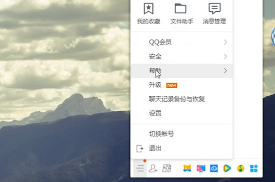 2、鼠标左键单击QQ界面左下角三横杠标志,再将鼠标箭头移至“帮助”选项。
